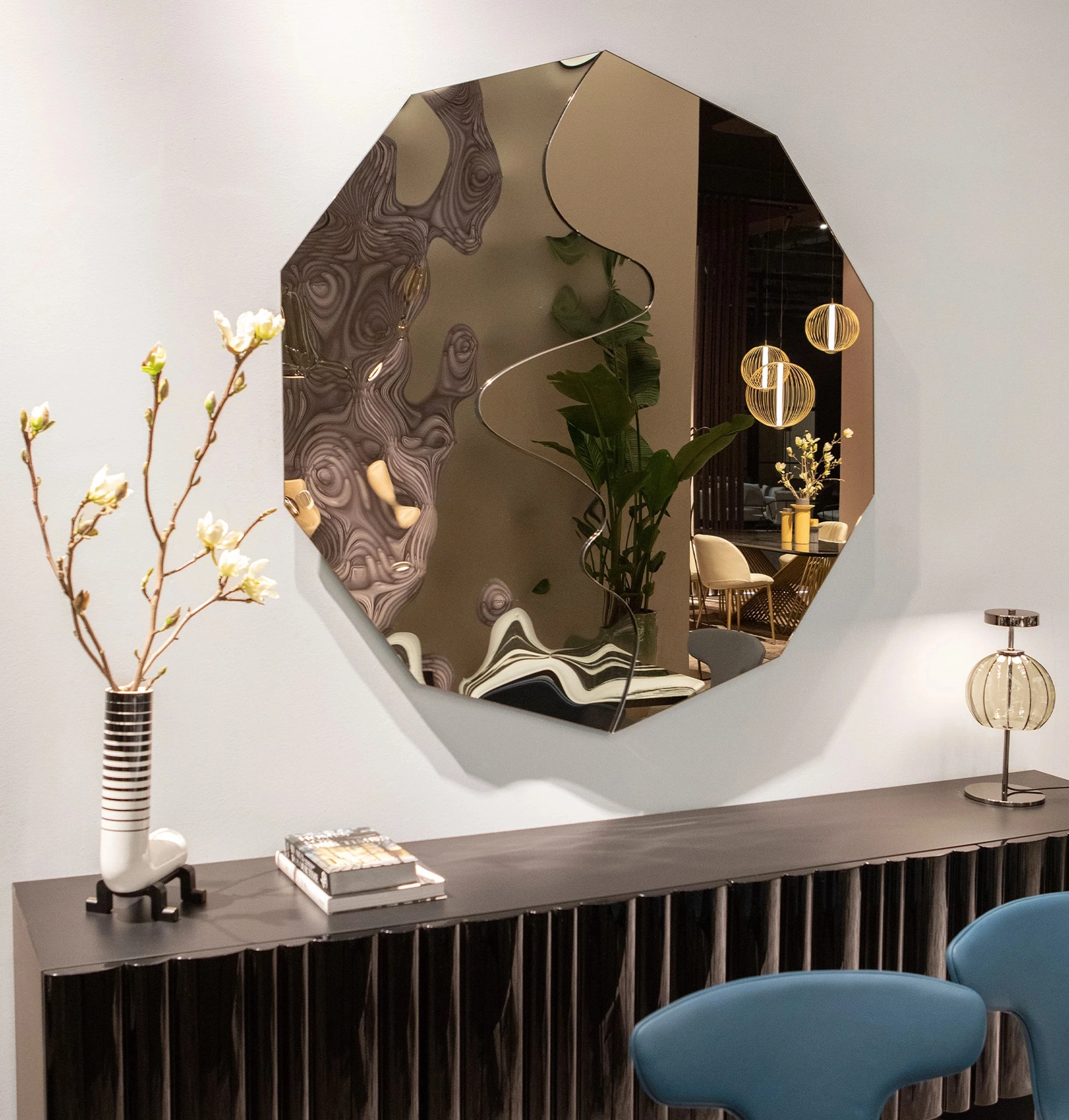 Complementi e specchi completano l'arredo di casa, occupando lo spazio in maniera utile e rendendolo accogliente e di grande valore estetico. Nel nostro showroom potrai vedere dal vivo l'eccellenza dei modelli di specchi design senza cornice del marchio, proprio come questa proposta in foto. Specchio scultoreo Decameron di Tonin Casa senza cornice: aggiungerà carattere e charme a un interno ammobiliato con mobili ed elementi accessori dai richiami design. Assai versatili e plurifunzionali, i Complementi design senza cornice rispondono a funzioni diversificate: ultimano le qualità pratiche e il valore estetico del locale. Le composizioni arredative di grande fascino del brand Tonin Casa personalizzano l'habitat con i loro colori e gusto, ricreando particolari atmosfere arredative.